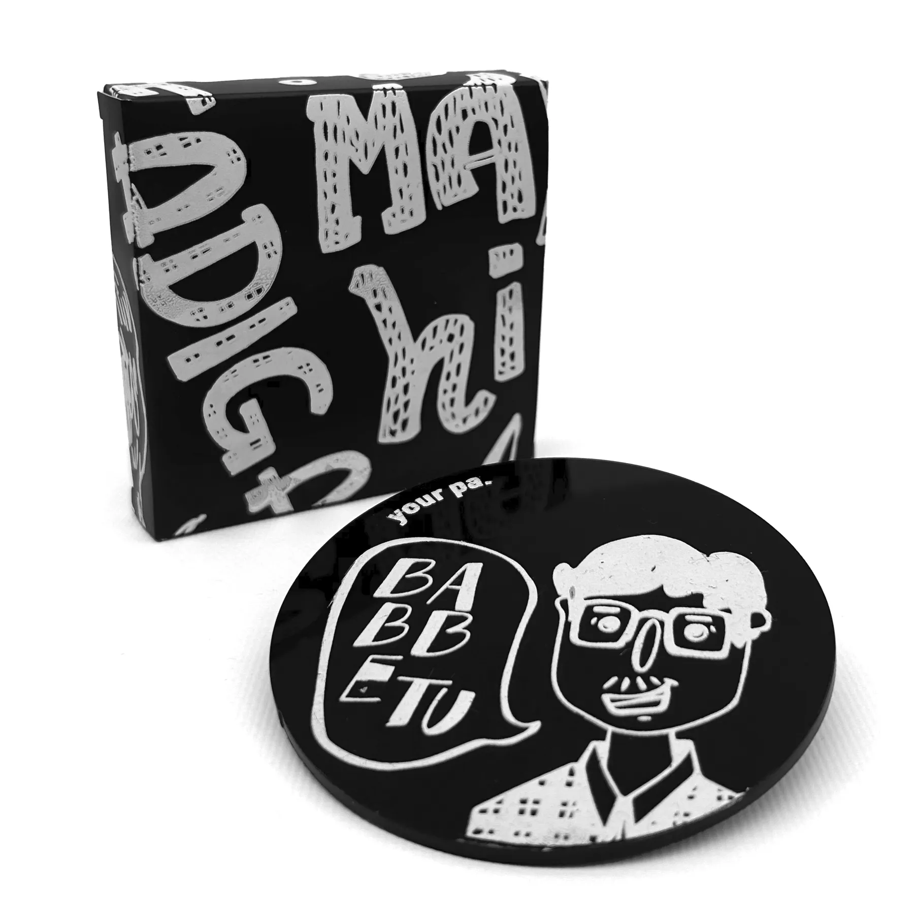 BABBETU –Unsolicited master advisor. Specialized in “I could fix it for you with just two nails.” Your pa. Part-time philosopher, full-time fixer. Master of “when I was your age…” speeches. Coaster/place marker in plexiglass featuring BABBETU illustration. Handmade, numbered, and unique.