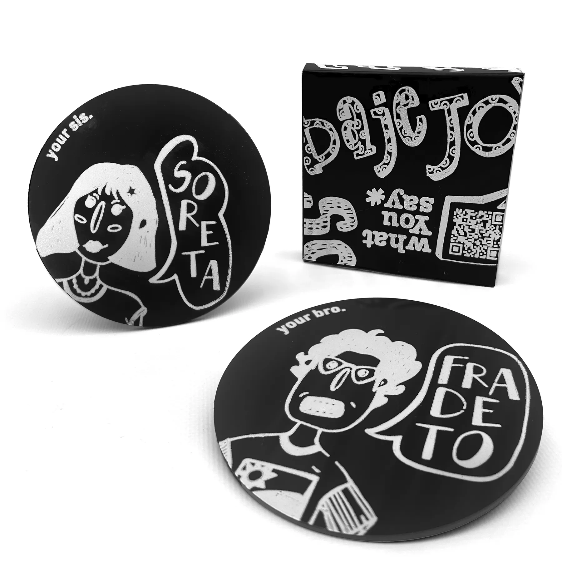 Made of 3 mm black plexiglass (9.5 cm diameter), they are perfect as coasters or place markers for dinners, lunches, and aperitifs that immediately become family stories. Each piece is numbered, unique, and designed to add a touch of irony and Marche identity to your table.
