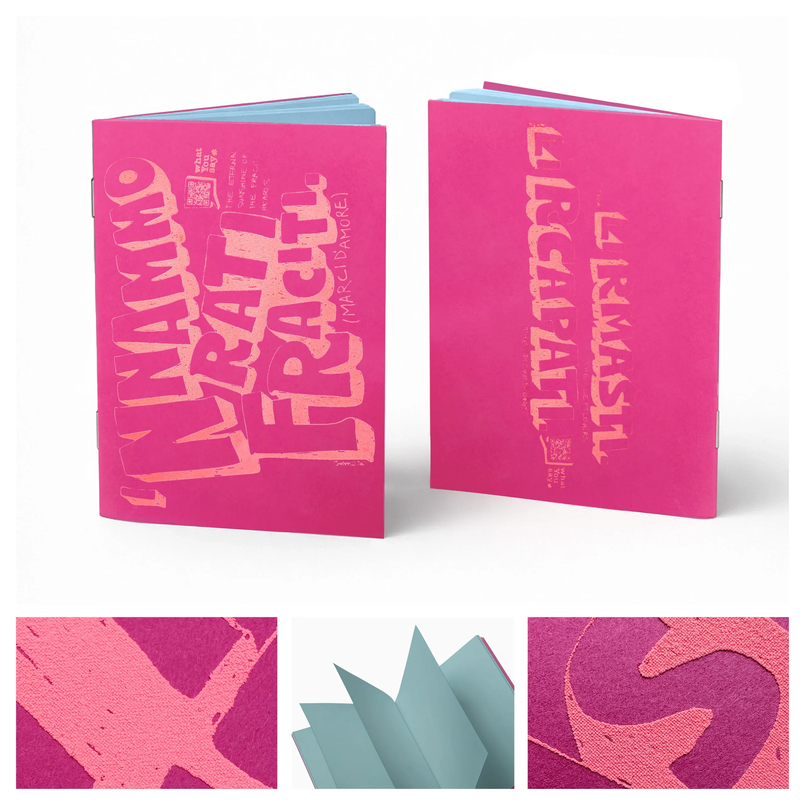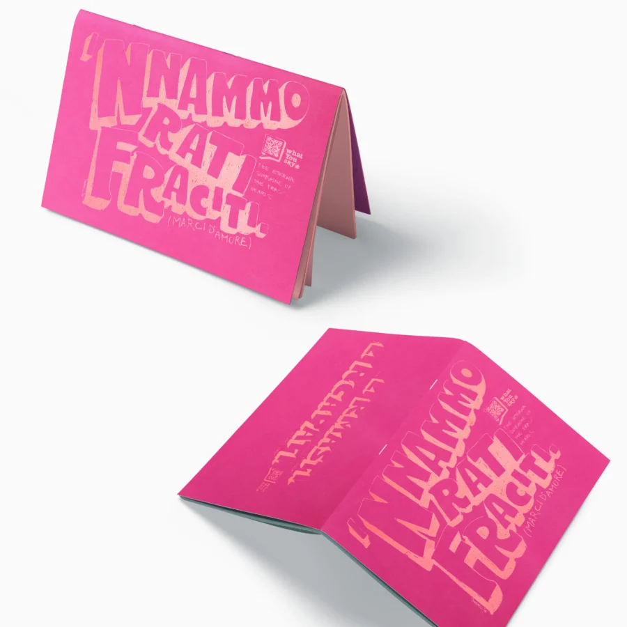 Nnammorati. Fraceti. Li rmasti e li rcapati. Un taccuino che nasce dall’amore locale — quello che resta, quello che torna, quello che si incastra tra orgoglio e appartenenza. La grafica in dialetto marchigiano dialoga tra fronte e retro come una piccola storia stampata su carta. Non è solo scrittura: è identità che si piega, si rilegge, si annota.