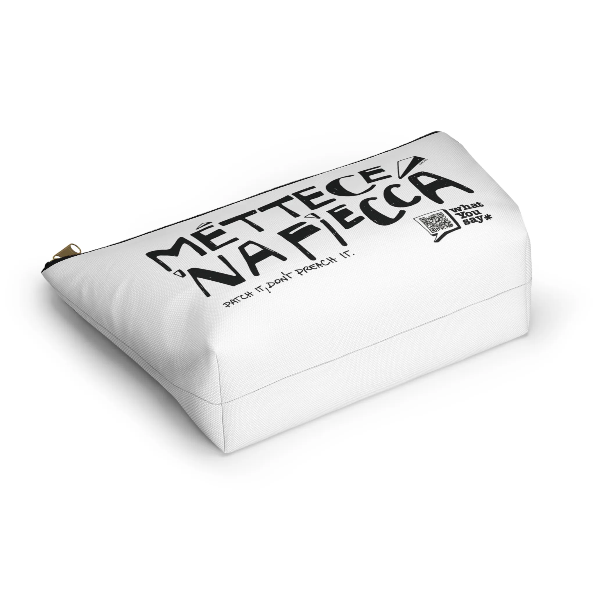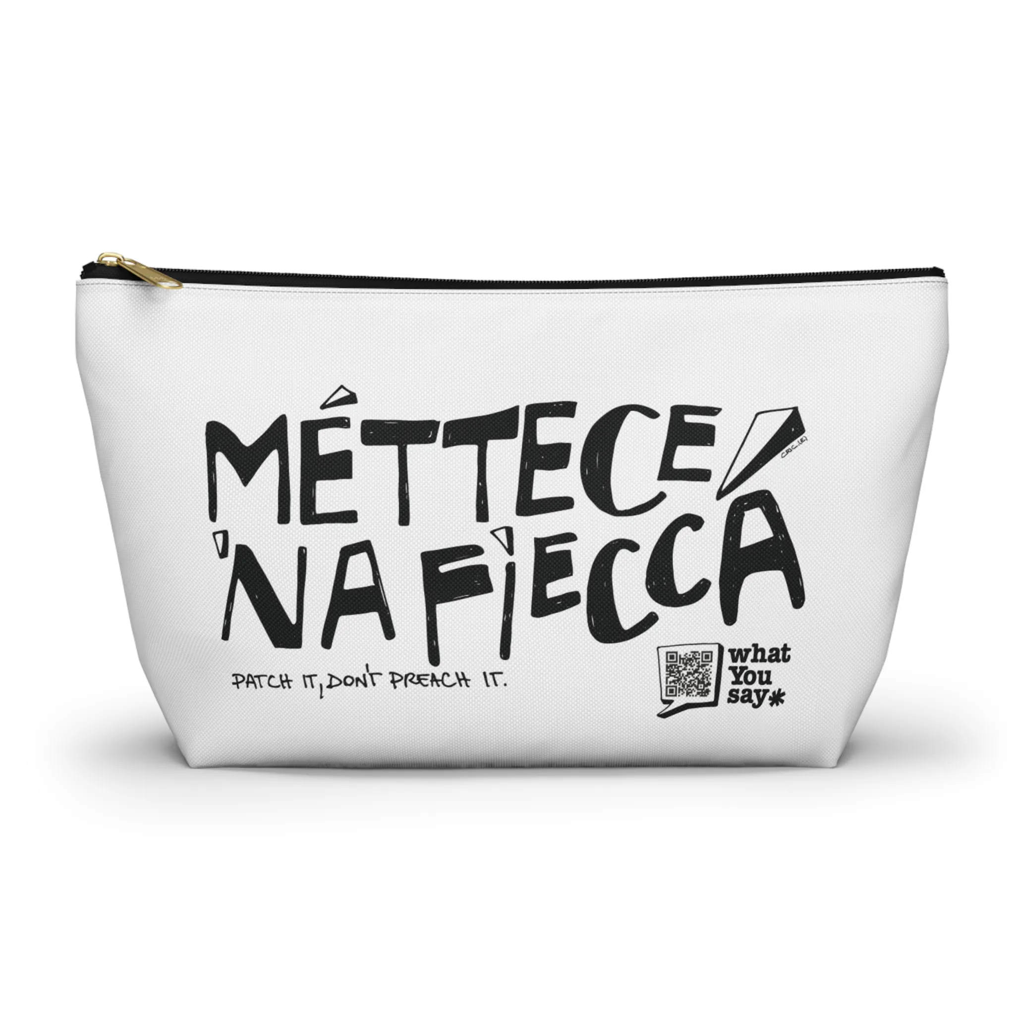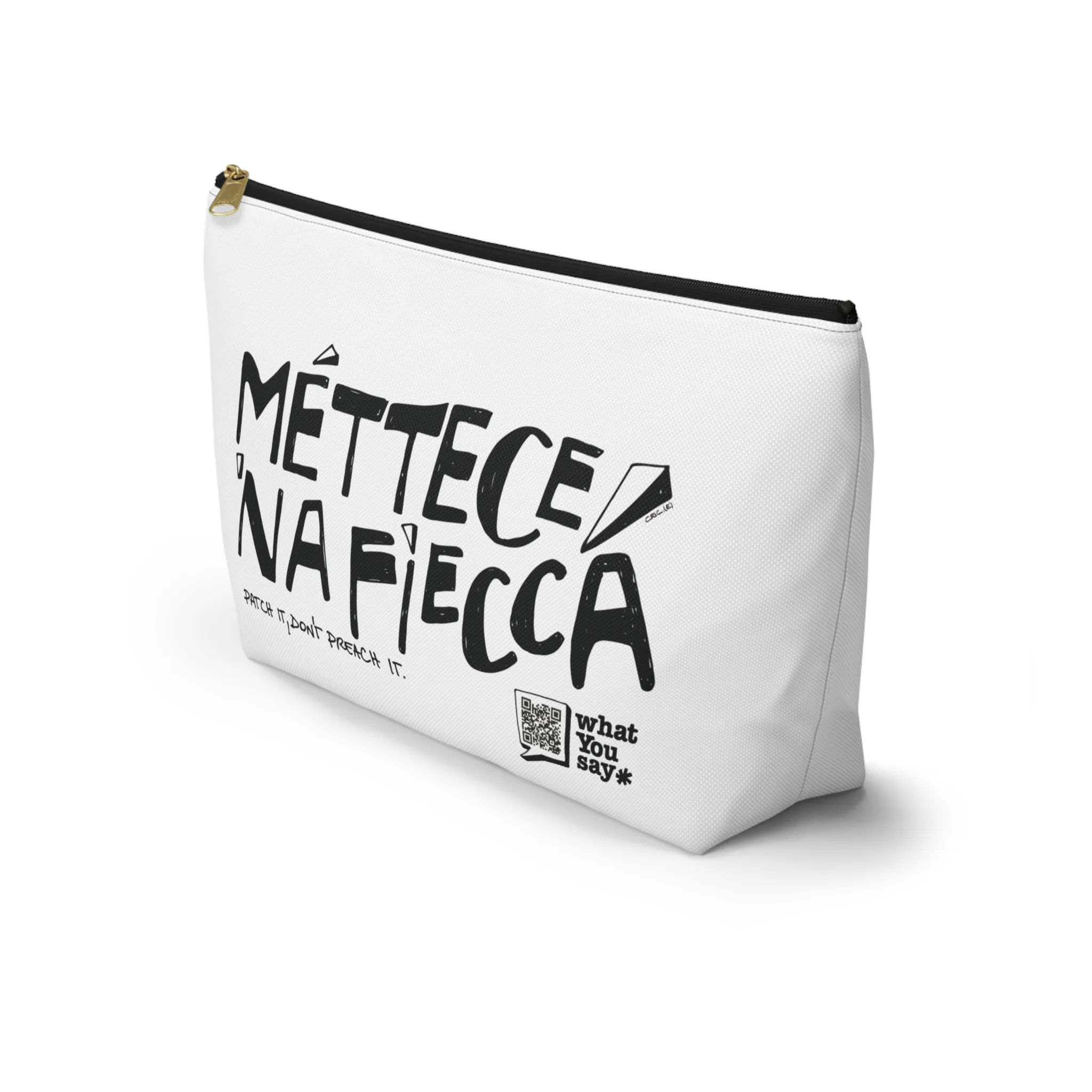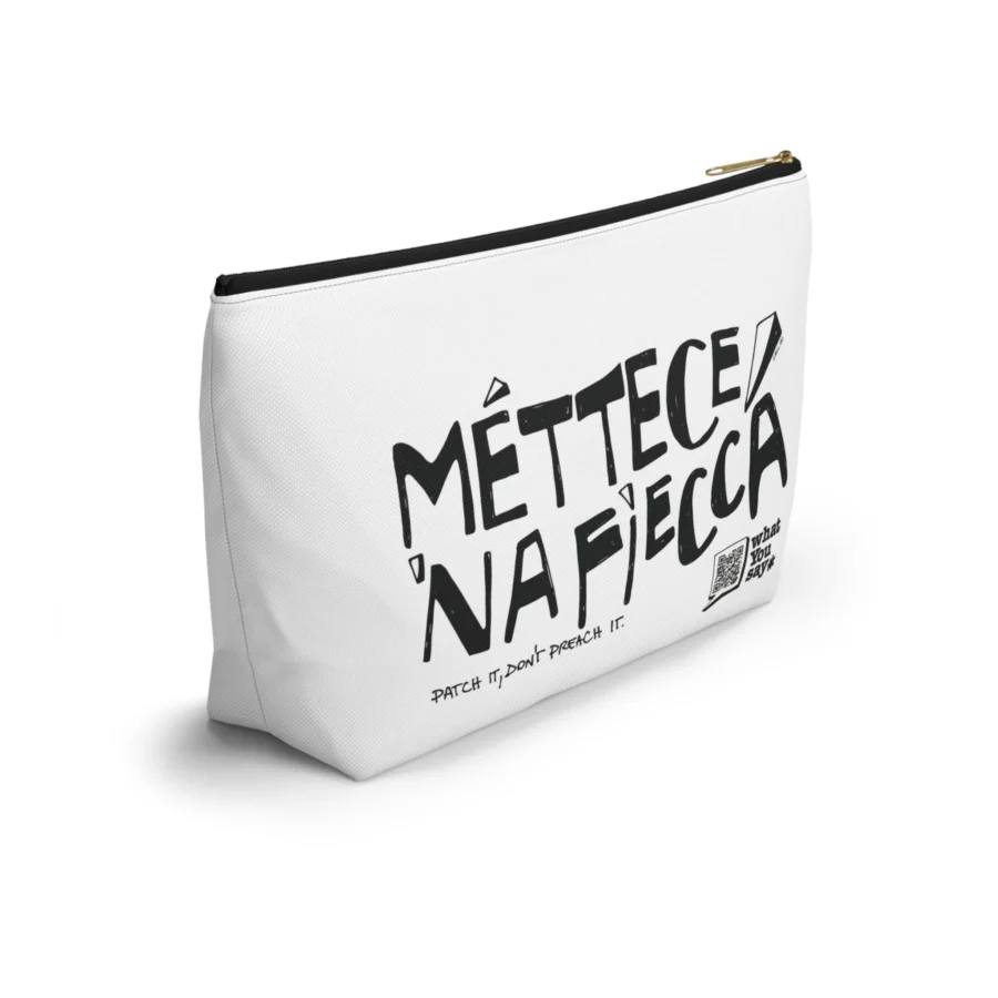 La pochette “Méttece ’Na Fiecca” porta nel quotidiano uno dei modi di dire più pratici e geniali del dialetto maceratese–fermano: metti una toppa, sistema, risolvi, chiudi la questione. Nel linguaggio marchigiano, la fiecca è quel piccolo cuneo di legno che si infilava sotto un tavolo traballante per aggiustarlo al volo. Una micro-soluzione concreta, zero prediche.