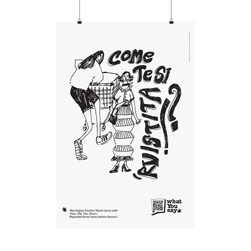 L’interpretazione visiva – Il poster ambienta la scena in un supermercato, uno dei luoghi più quotidiani e osservati della vita marchigiana ma in generale italiana. Una figura con il carrello si gira a guardare un’altra persona, attivando quel meccanismo silenzioso di giudizio, curiosità e riconoscimento. La tipografia dialoga con la scena, trasformando uno sguardo qualsiasi in un momento narrativo: quello in cui nasce la domanda “Come te si ‘rvistita!?”. La composizione restituisce ironia, controllo sociale e complicità implicita, parte della ricerca WhatYouSay sul linguaggio e i simboli dei territori.