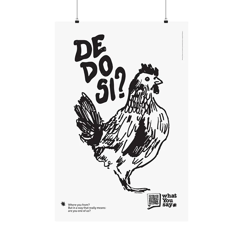 L’interpretazione visiva: Il poster traduce la parola in forma grafica attraverso la tipografia dinamica e la presenza del gallo, simbolo di voce, energia e risveglio. Il segno cattura ritmo e musicalità della frase, con colori vivi e composizione equilibrata, parte della ricerca WhatYouSay sul linguaggio dei territori.