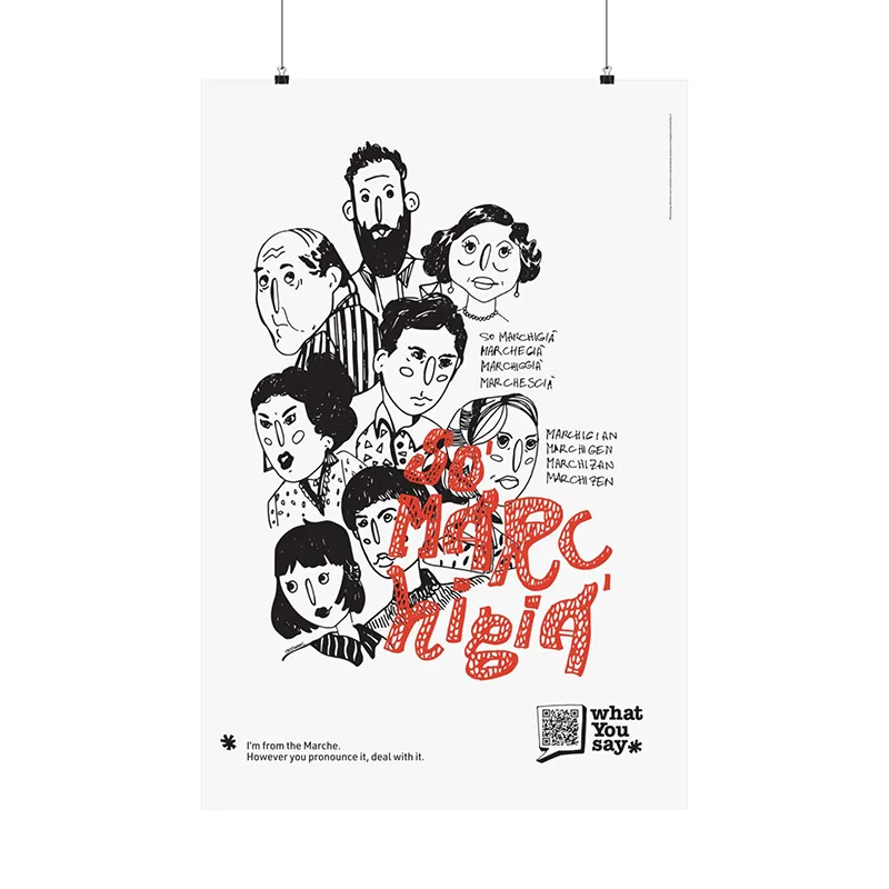 L’interpretazione visiva: Il poster traduce l’identità in forma visiva attraverso una tipografia forte e una serie di personaggi — caratteri marchigiani — che diventano rappresentazione collettiva del territorio. Figure diverse, riconoscibili, quasi archetipi locali: ognuna porta con sé un modo di parlare, stare, vivere. Il segno costruisce un racconto corale, tra ironia e appartenenza, con colori vivi e composizione dinamica. Parte della ricerca WhatYouSay sul linguaggio dei territori.